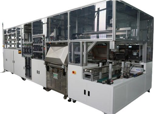 2D Code檢查分類、Tray盤自動包裝打帶、放置濕度卡乾燥包、包裝抽真空、自動貼標
